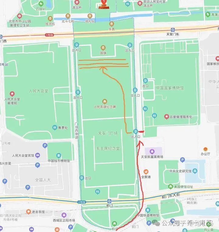 If you’re staying near (前门) Tiananmen Gate and (大栅栏) Hutong, here’s your route to watch the flag-raising ceremony. The map indicates the starting point for security checks (marked by the red arrow). Be aware that queues can be long, especially when crowds are large. To ensure a good view of the flag-raising, wake up early and position yourself at the front of the line. The distance to the flag platform is already somewhat far.
